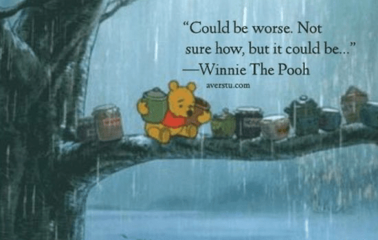 To pull this thread a little further, ‘it could be worse’ makes assumptions that may not necessarily be true. It may be the case that Scenario A’s material devastation is not as catastrophic as Scenario B – but, and here’s the kernel of my argument, the interlocuter cannot ever know the effect of any devastation upon the mental wellbeing of the sufferer. It could be the case that both mine and my neighbours home flood simultaneously. We are both are fully insured and whilst it is upsetting, we both can make repairs and muddle through. However, the flood is the final straw for my neighbour and is the final blow from unfortunate event upon unfortunate event. Whilst we have both experienced the same material catastrophe – we deal it with very different ways. I may take the interlocuters ‘could be worse’ idiom in the stoic nature it is given, but my neighbour’s suffering is tenfold mine and these well-meaning words could make matters worse. That’s because ‘Could be worse’ doesn’t seek to alleviate distress, only to compartmentalise and rationalise it. Well, there’s a time and a place for that.